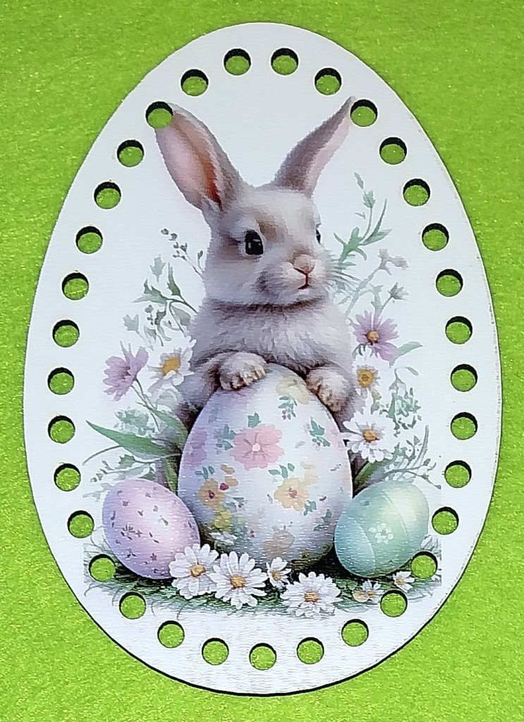 11x15cm Iepuraș stand cu oua croșetabil imprimat . Cu gaura de 6mm, 1 bucata, grosime 3mm.