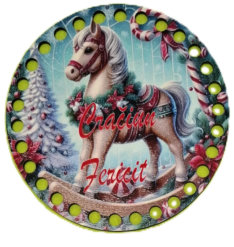 12cm Baza din lemn crosetabil imprimat Cal balansoar cu inscripție de Craciun Fericit˘. Cu gaura de 7mm, 1 bucata, grosime 2,5mm.