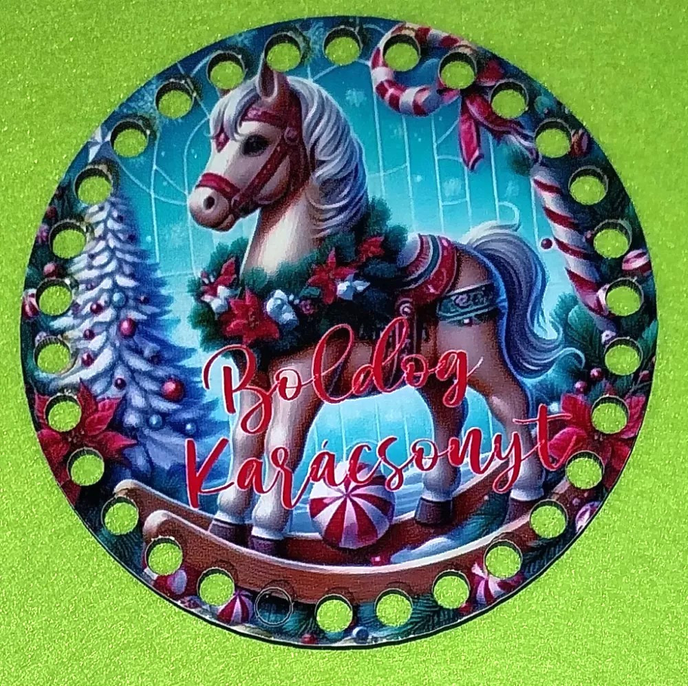 12cm Baza din lemn crosetabil imprimat Cal balansoar cu inscripție de Boldog Karácsonyt. Cu gaura de 7mm, 1 bucata, grosime 2,5mm.