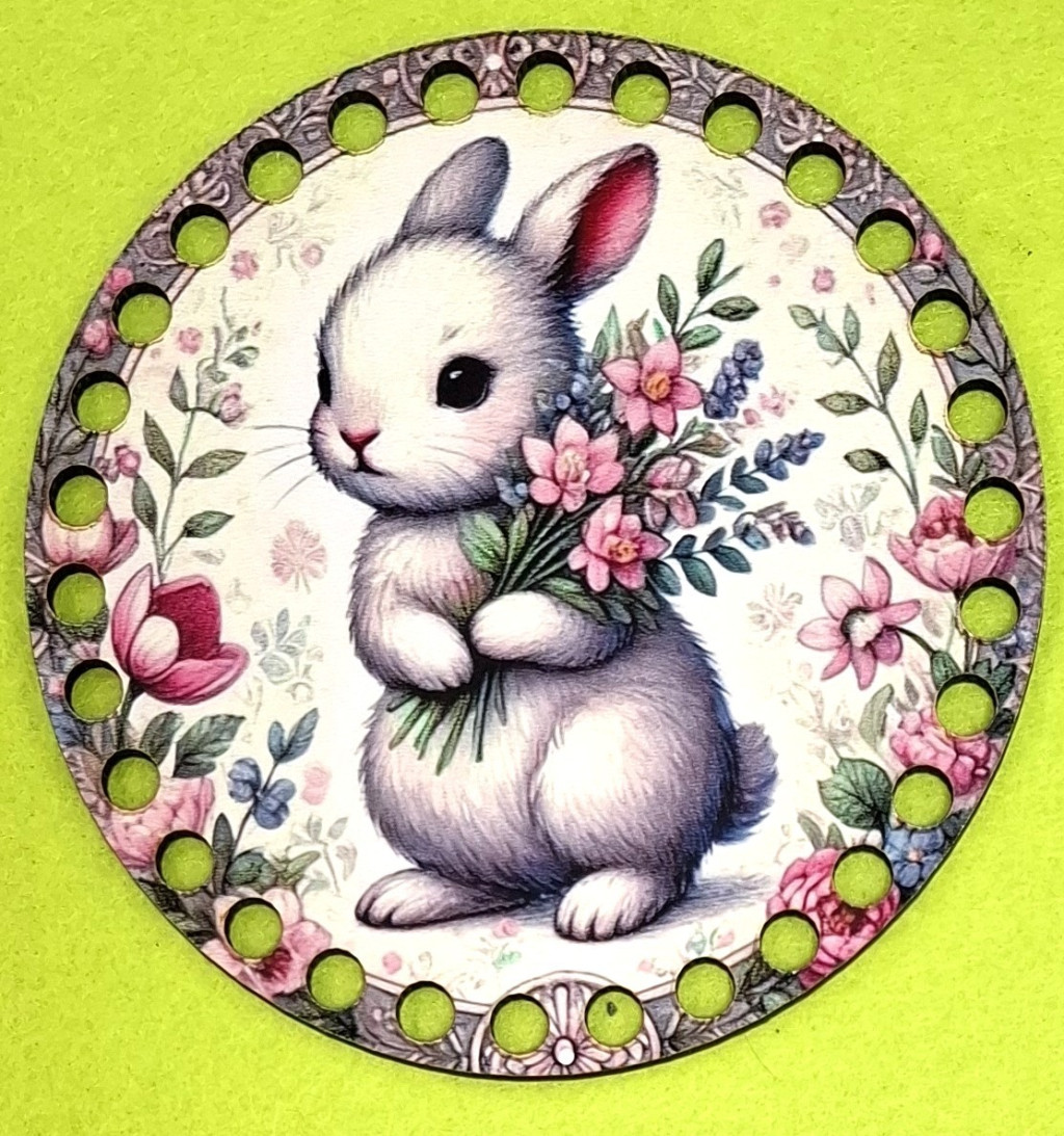 12cm Baza din lemn imprimata crosetabil Iepuras alb cu buchet de flori cu 7mm, 1 bucata/pachet, grosime 3mm.
