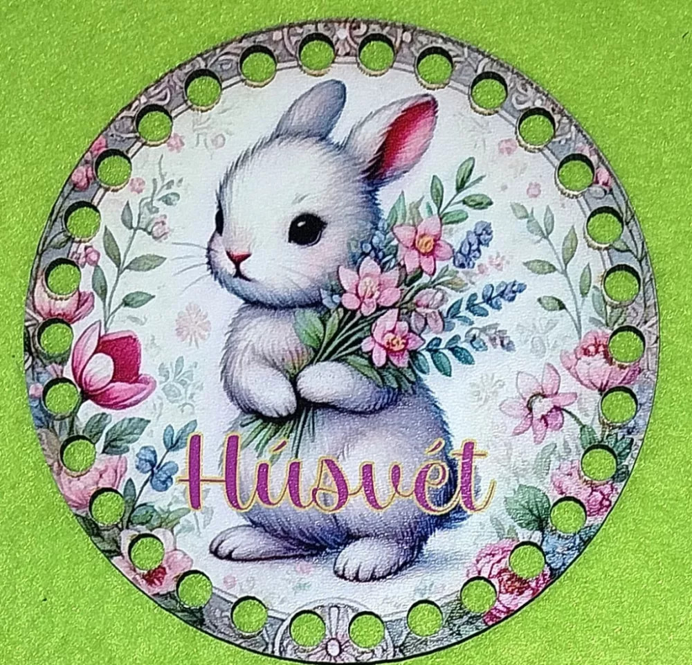 12cm Baza din lemn imprimata crosetabil Iepuras alb cu buchet de flori cu inscriptie de Húsvét. Cu gaura de 7mm, 1 bucata/pachet, grosime 3mm.