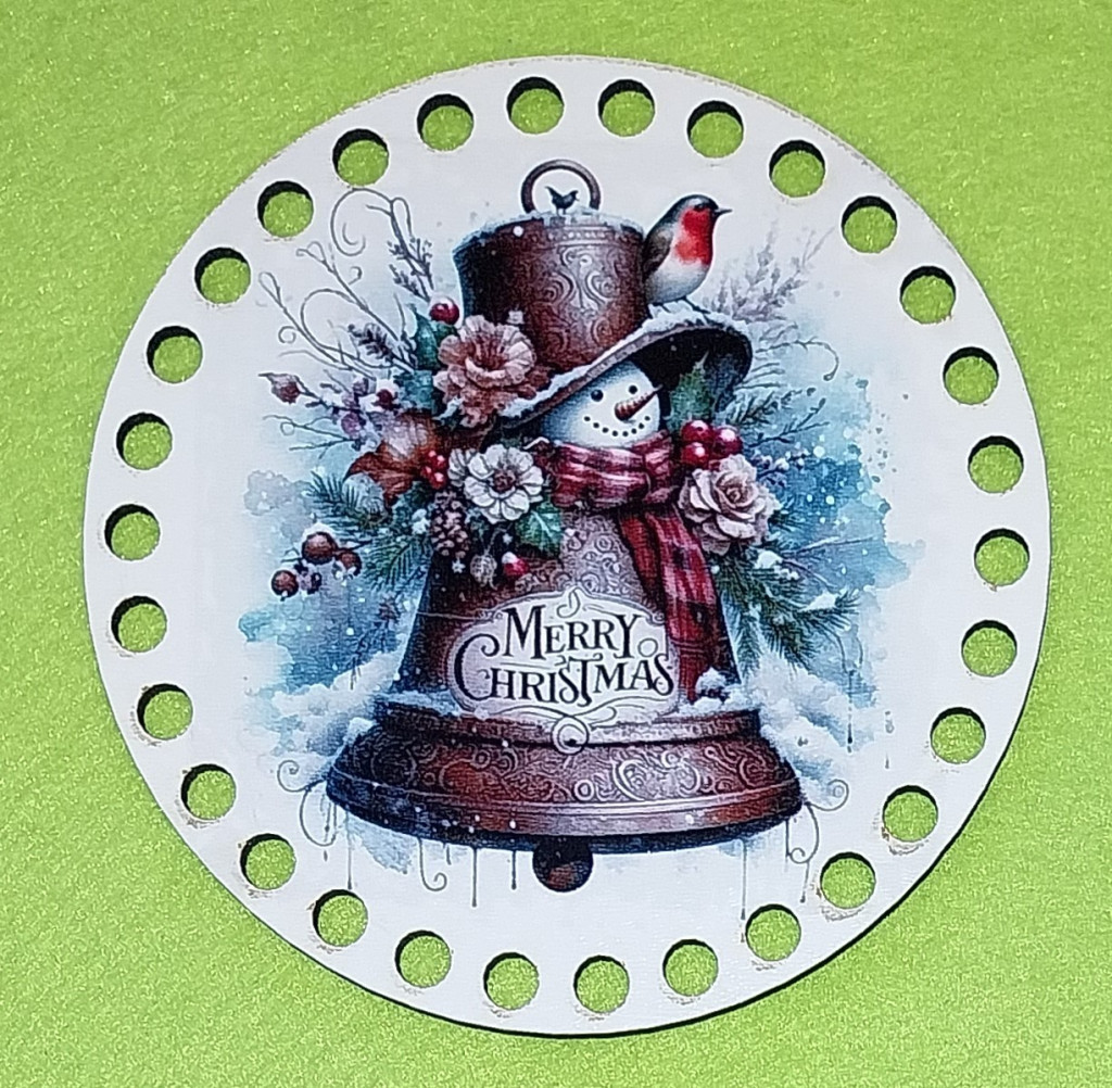 12cm Baza din lemn imprimata crosetabil cu gaura de 7 mm Clopotel cu om de zapada și inscriptia Crăciun Fericit. 1 bucata, grosime de 2,5mm.