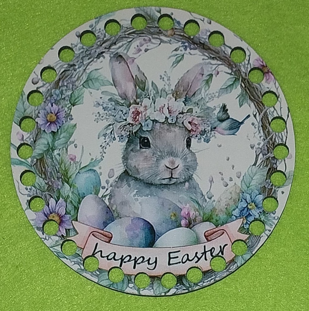 12cm Baza din lemn imprimata crosetabil cu gaurs de 7 mm Iepuras cu oua și inscriptia Paște fericit. 1 bucata/pachet, grosime 2,5mm.