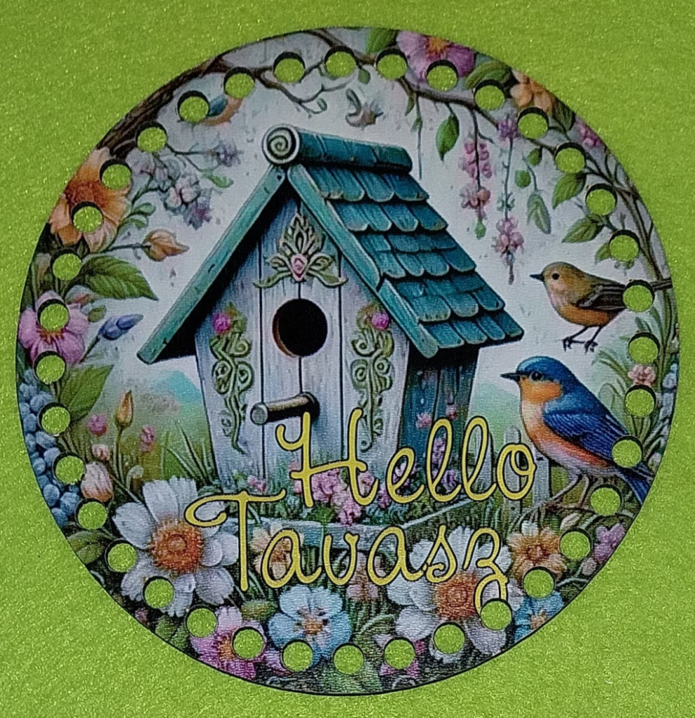 15cm Baza din lemn imprimata crosetabil cu gaura de 7 mm, hranitoare pentru pasari cu acoperis verde si inscriptia „Hello Tavasz”. 1 bucata, grosime 2,5mm.