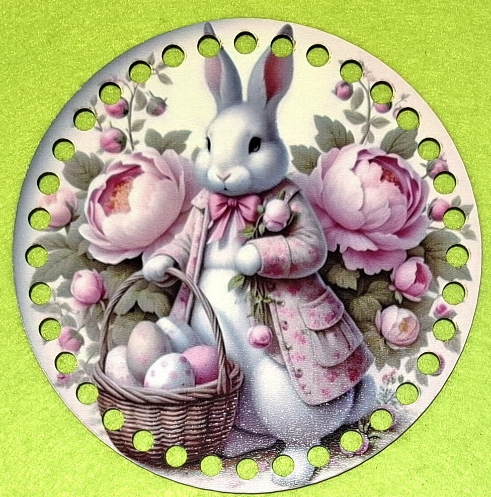 15cm Baza din lemn imprimata crosetabila cu gaura de 7 mm Iepuras alb cu floare roz 1 buc. 15 cm grosime 2,5 mm