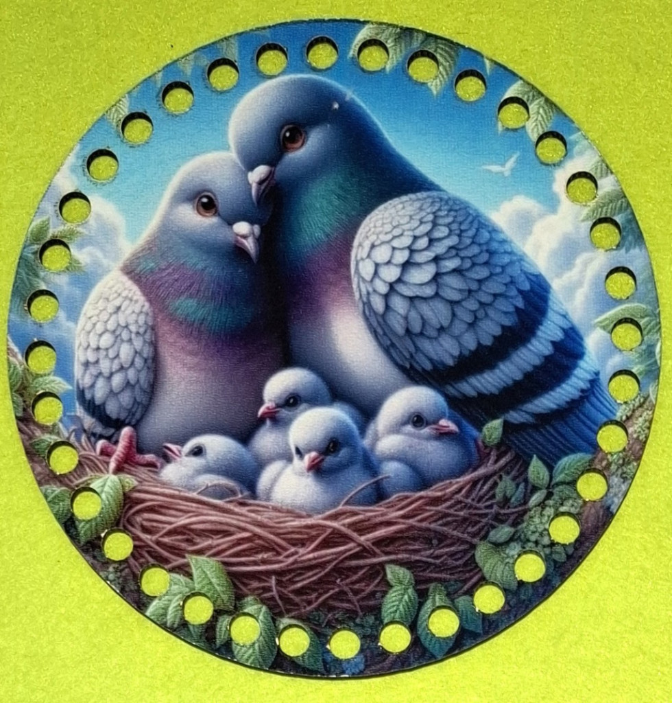15cm Baza din lemn imprimata crosetabila cu gaura de 7 mm Pereche de porumbei cu pui 1 buc 15 cm grosime 2,5 mm