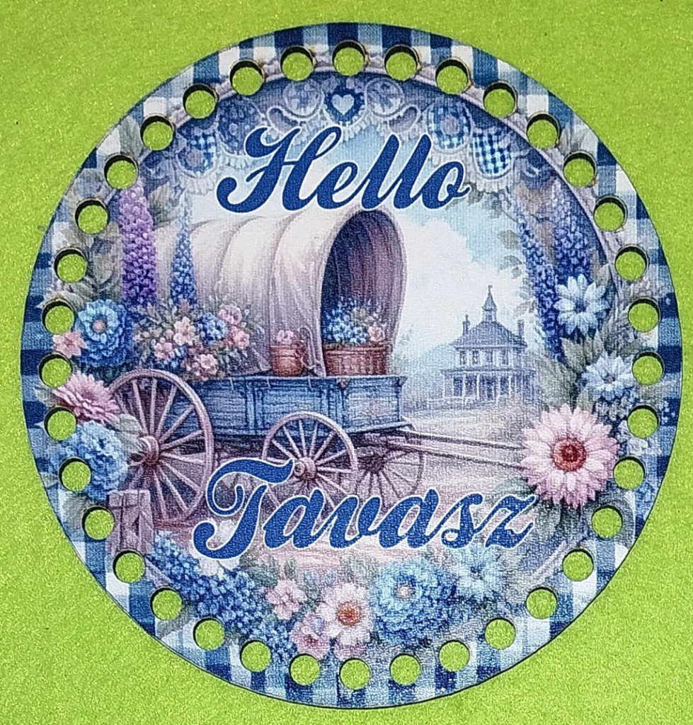 15cm Baza din lemn imprimata crosetabila cu gauraă de 7 mm Fundal albastru în carouri cu carucior si inscripsia „Hello Tavasz” 1 buc/pachet 15 cm grosime 2,5 mm
