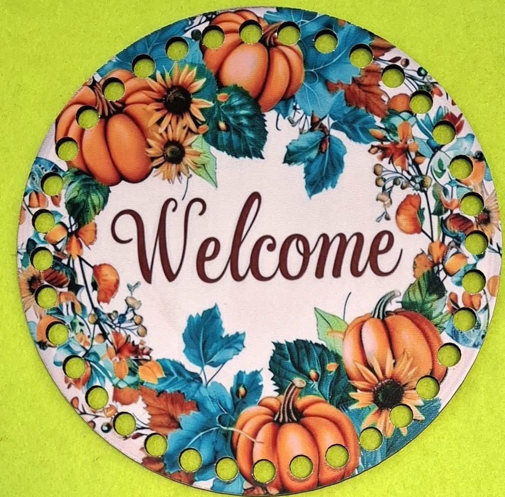 15cm Coroana de dovleac cu baza din lemn imprimata crosetabil, cu inscriptie de bun venit, gaura de 7 mm, 1 buc., grosime de 15 cm, 2,5 mm.