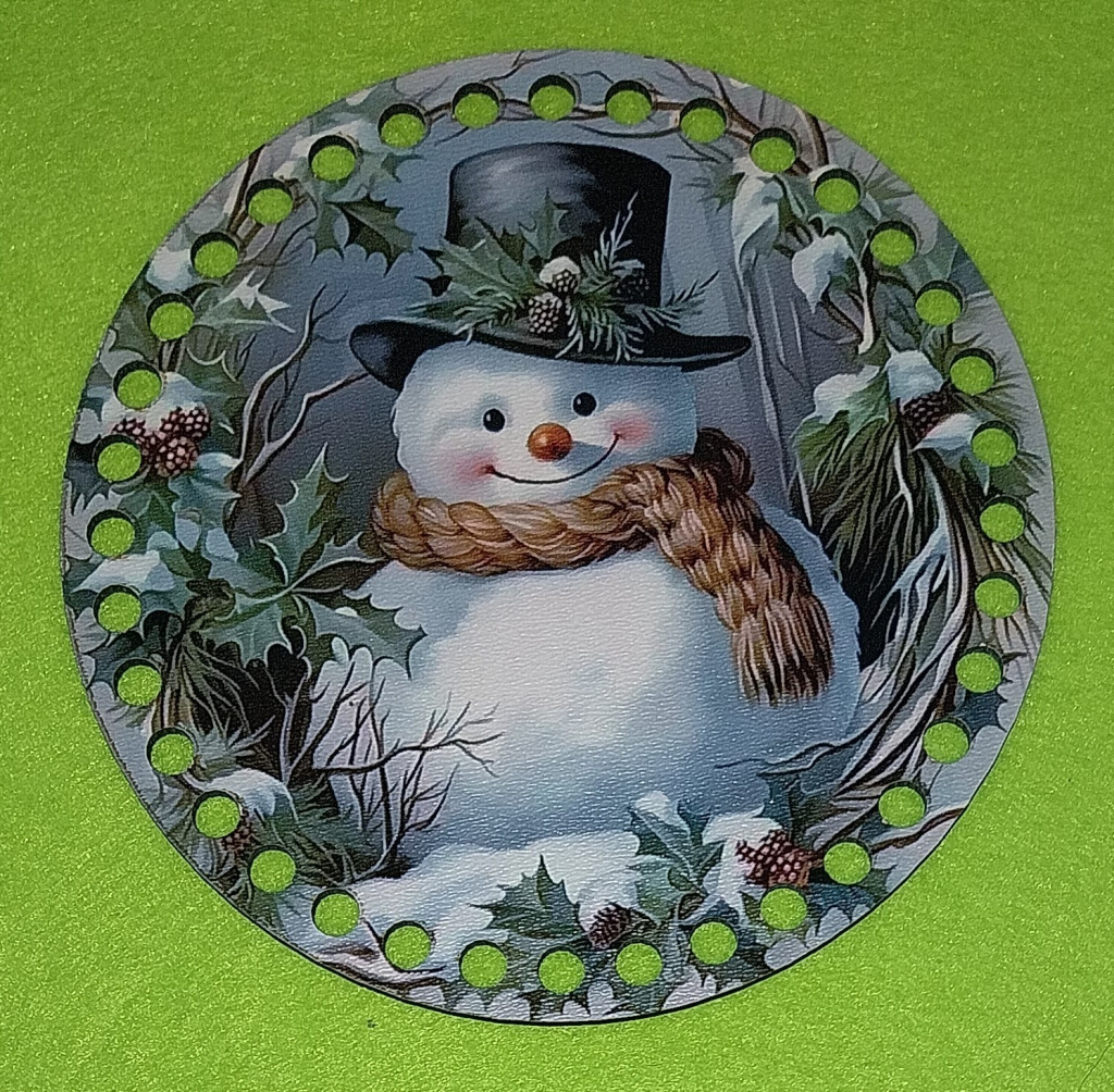 15cm Coroana din lemn imprimata crosetabila cu gaura de 7 mm si de om de zapada cu esarfa. 1 bucata, grosime 2,5mm.