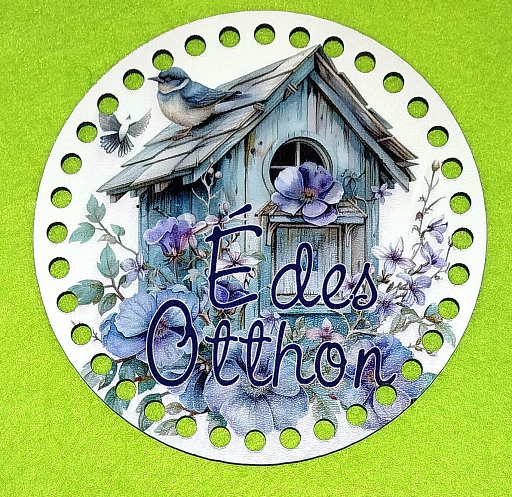 15cm Hranitoare pentru pasari tip casuta gri, cu baza din lemn imprimata crosetabil, flori mov si inscriptia Édes Otthon. Cu gaura de 7mm, 1buc/pachet, grosime 3mm.