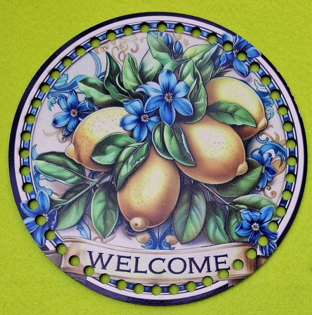 19,5cm Baza din lemn imprimata crosetabil, ciorchine de lamaie cu inscriptie de bun venit, gaura de 7 mm, 1 buc. 19,5 cm, grosime 2,5 mm.