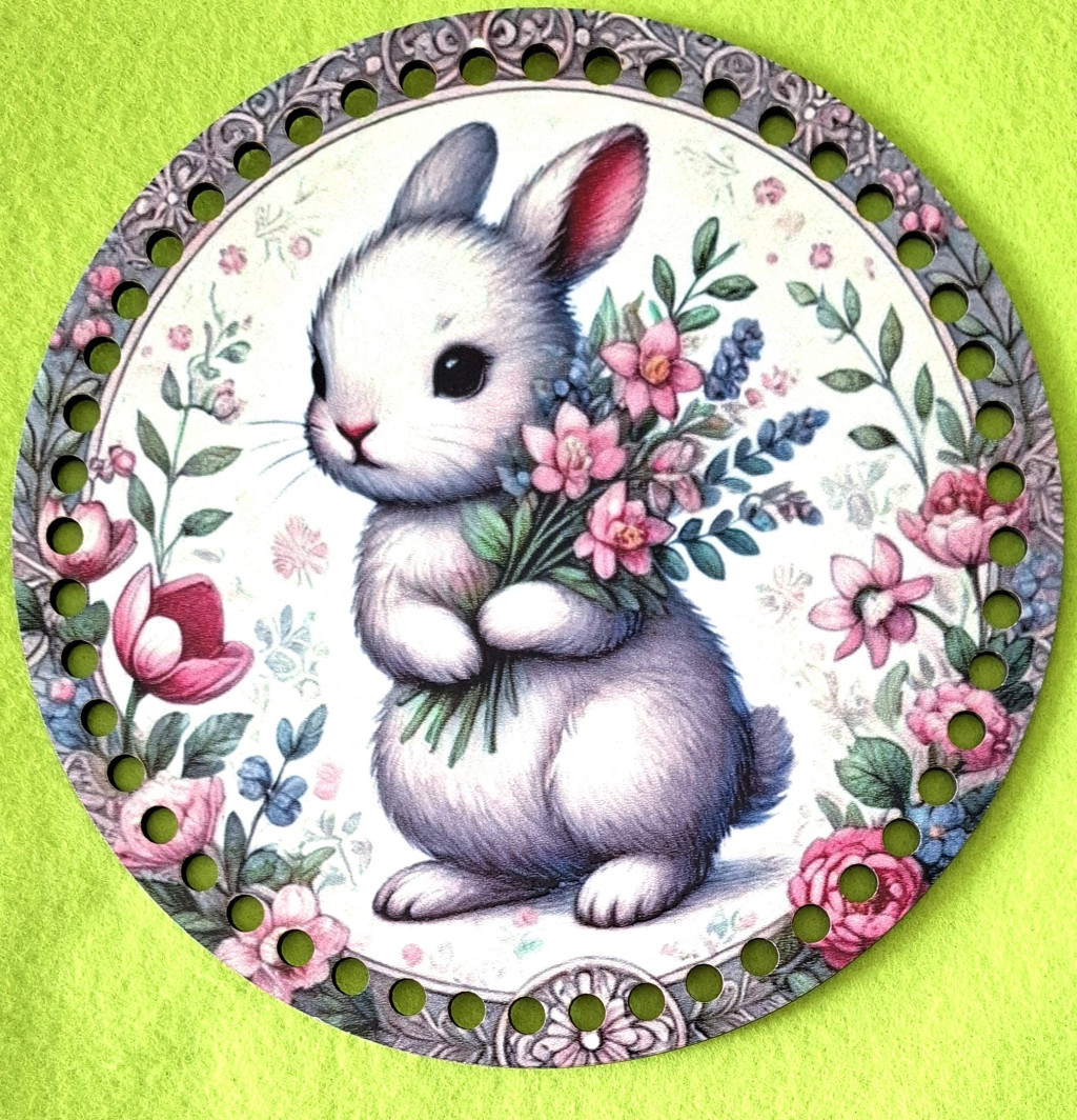 19,5cm Baza din lemn imprimata crosetabil Iepuras alb cu buchet de flori cu 7mm, 1 bucata/pachet, grosime 3mm.
