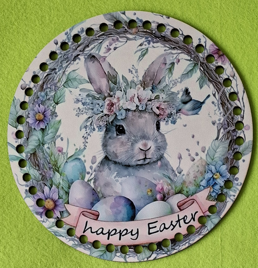 19,5cm Baza din lemn imprimata crosetabil cu gaurs de 7 mm Iepuras cu oua și inscriptia Paște fericit. 1 bucata/pachet, grosime 2,5mm.