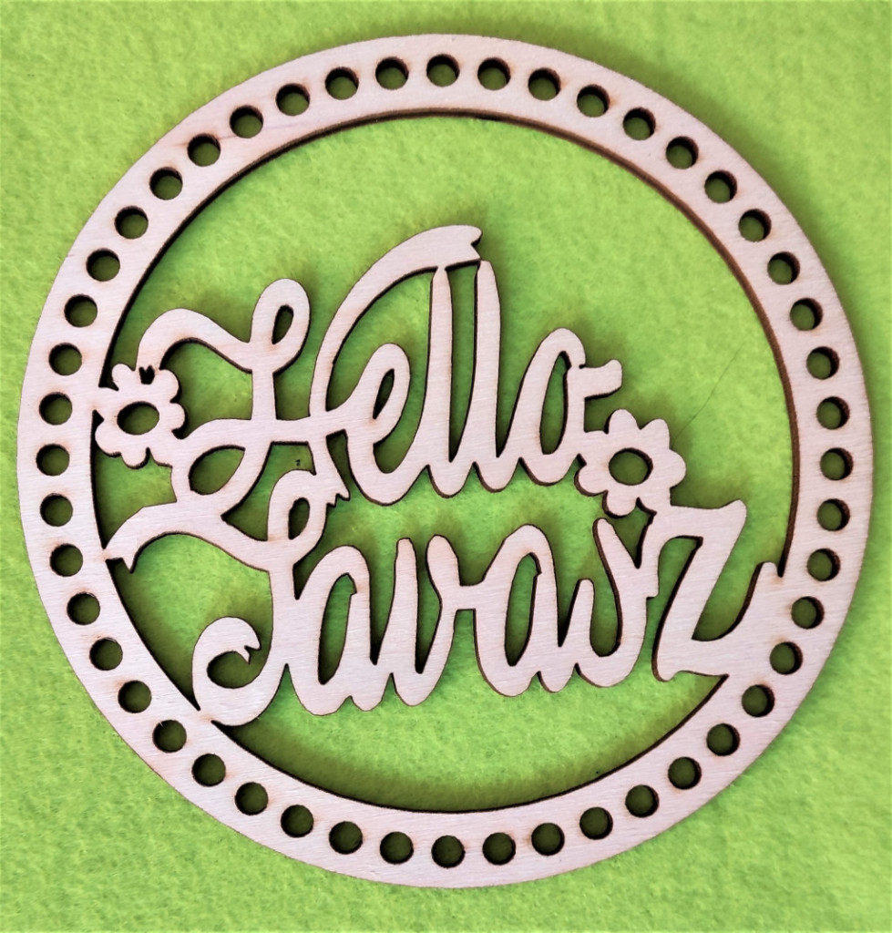 22cm Baza circulara crosetabila din lemn natural cu gaura de 7 mm Hello Spring cu inscriptie ajurata 1 buc. grosime 3 mm