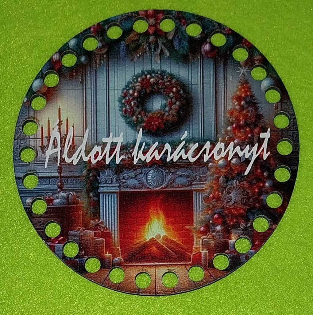 Baza din lemn crosetabil de 12cm in forma de semineu cu inscriptia Áldott karácsonyt. Cugaura de 7mm, 1 bucata, grosime 2,5mm.