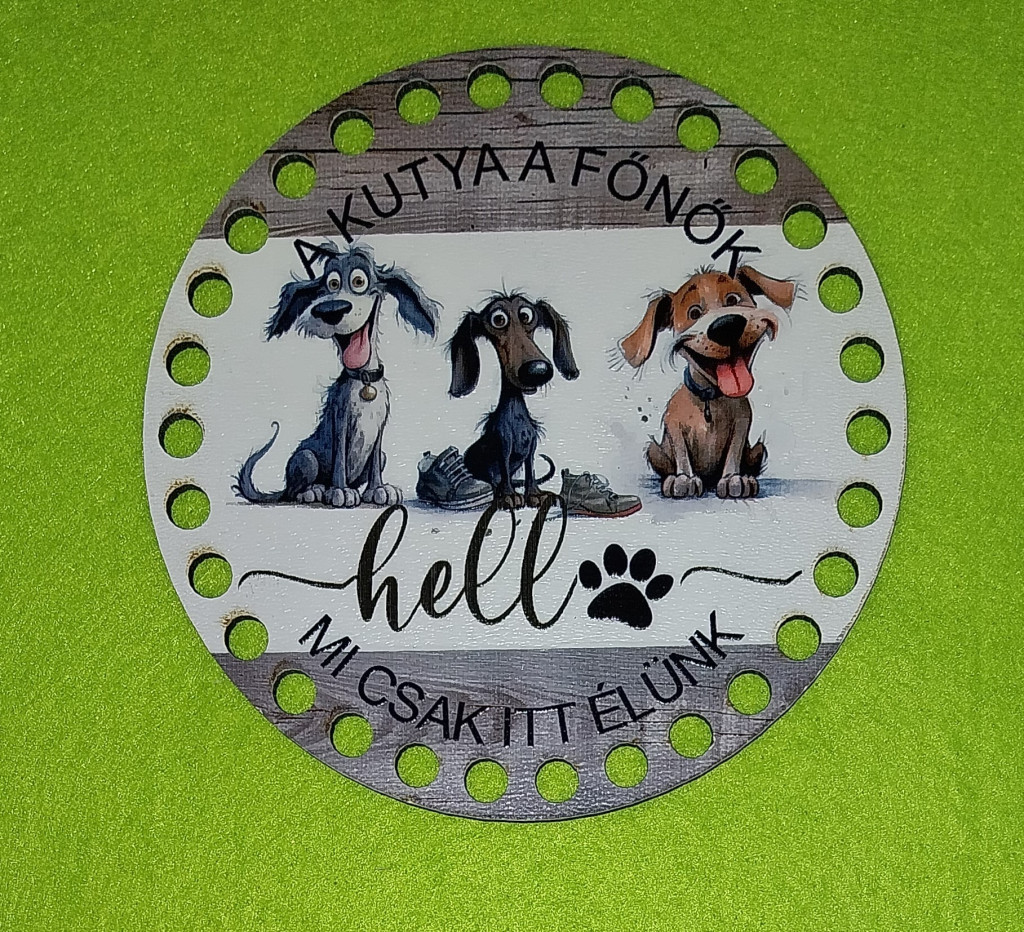 Baza din lemn crosetabila de 12cs A kutya a főnök felirattal nyomtatva, csak mi lakunk itt..... Marime gaura de 12cm, 1 bucata, grosime 2,5mm.