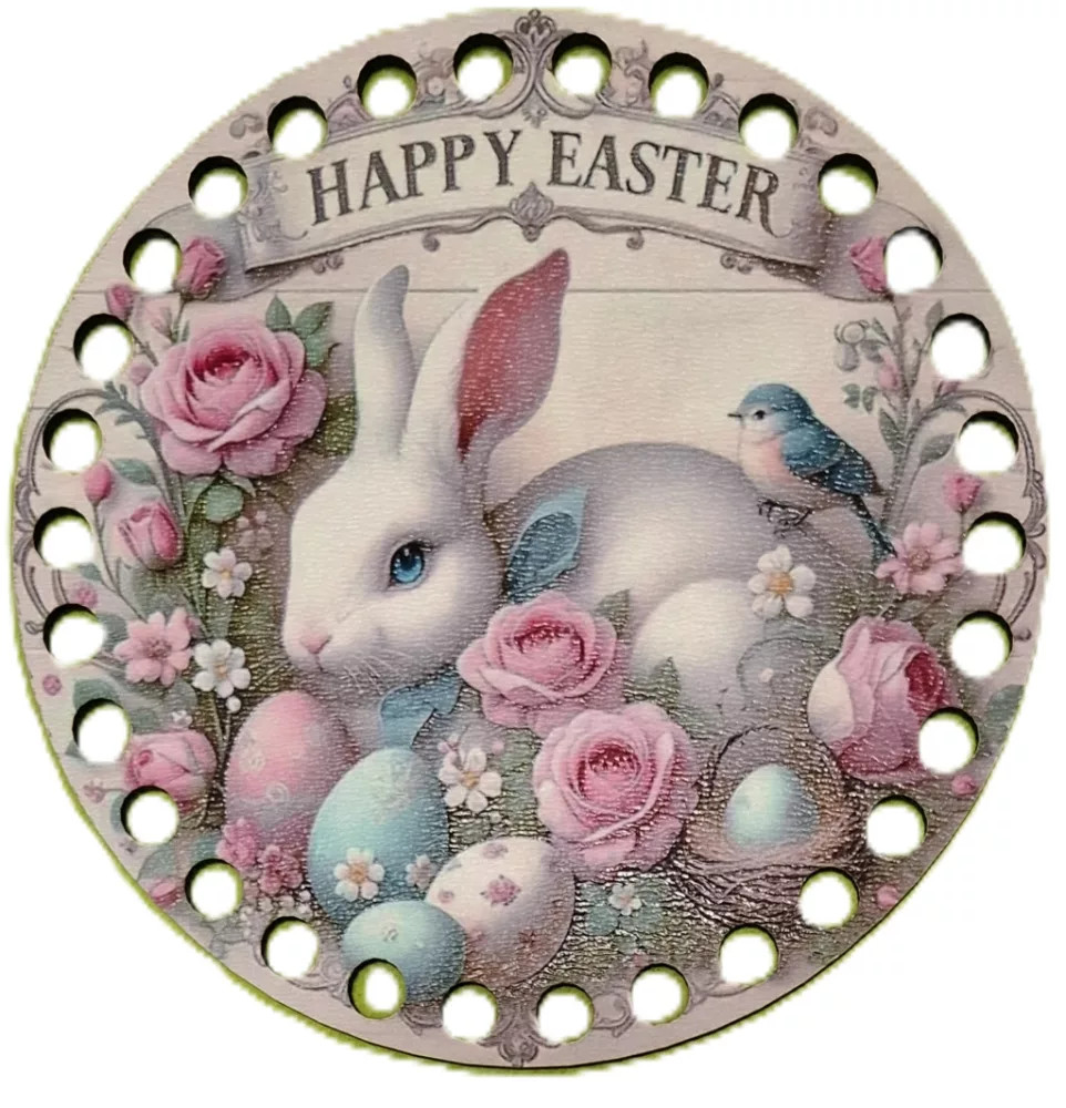 Baza din lemn imprimata crosetabil cu gaura de 7 mm Iepuras alb cu flori Inscriptie Happy Easter , 1 bucata/pachet, grosime 2,5 mm.