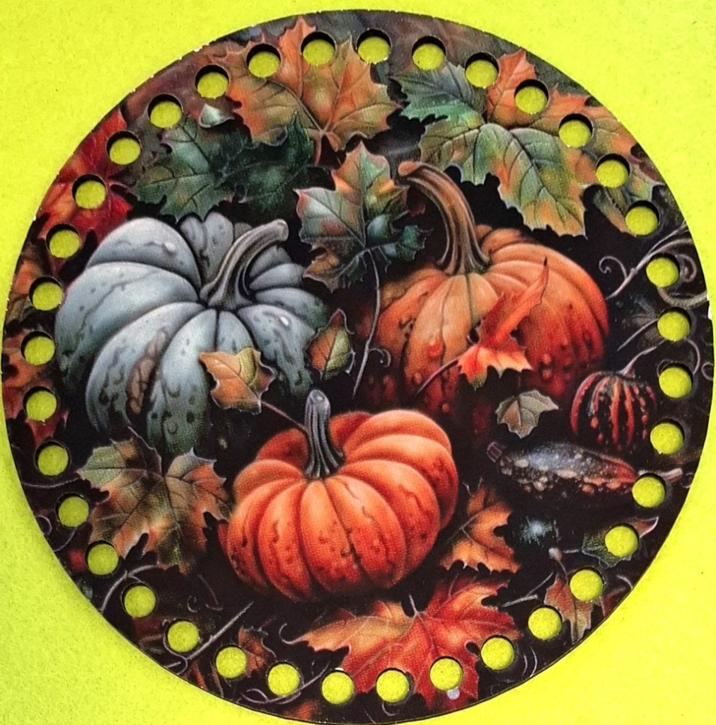 Baza din lemn imprimata crosetabila, dovleci între frunze cu gaura de 7 mm, 1 buc., 15 cm, grosime 2,5 mm
