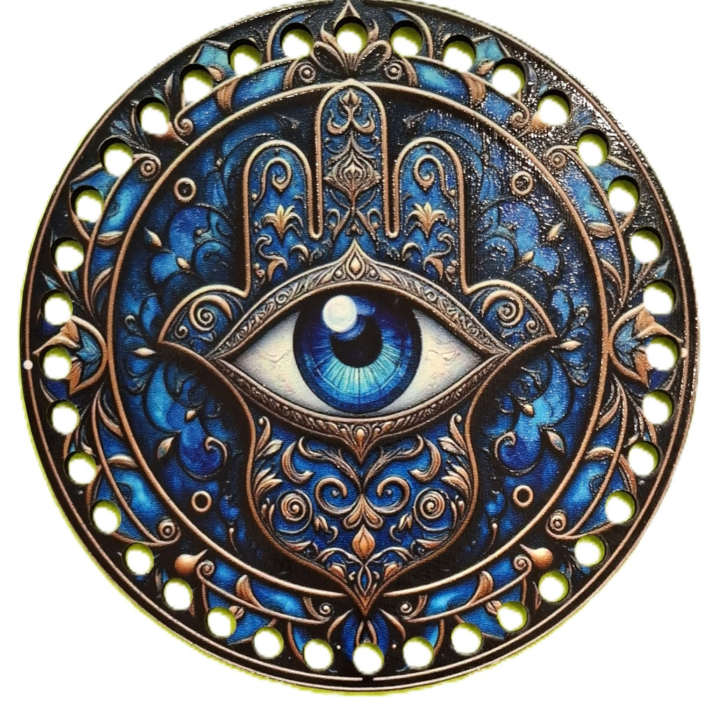 Baza din lemn natural crosetabil mana albastra Fatima imprimat cu model Ochiul care vede tot cu gaura de 7mm, 15cm, grosime 2,5mm