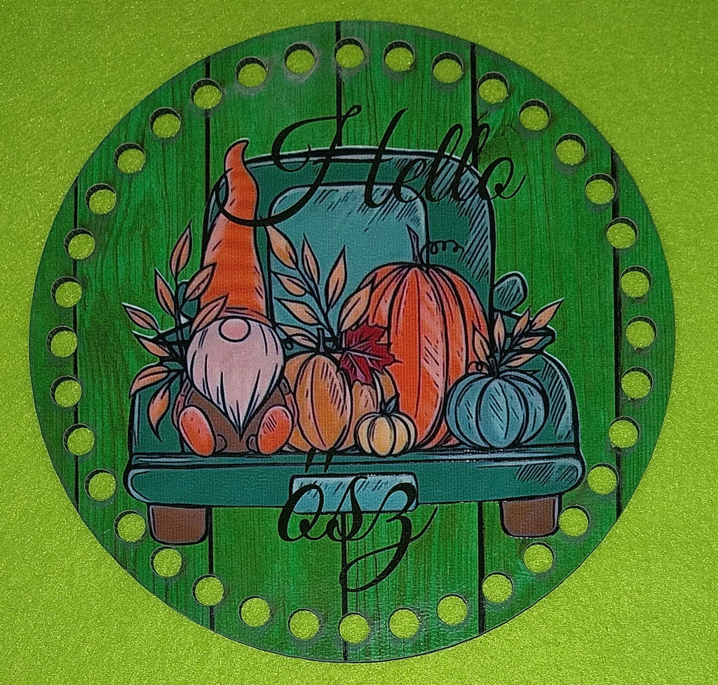 Ciocanel din lemn imprimat croetabil cu gaura de 7 mm, elf pe o mașină verde cu inscriptia Hello őssz. 1 bucata 15cm, grosime 2,5mm.