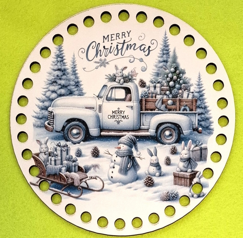 Ciocanitoare din brad imprimată crosetabila în mijloc, cu fundal înzapezit, iepuras așezat pe masina cu inscriptia Crăciun Fericit, 1 buc. 15 cm, grosime 2,5mm