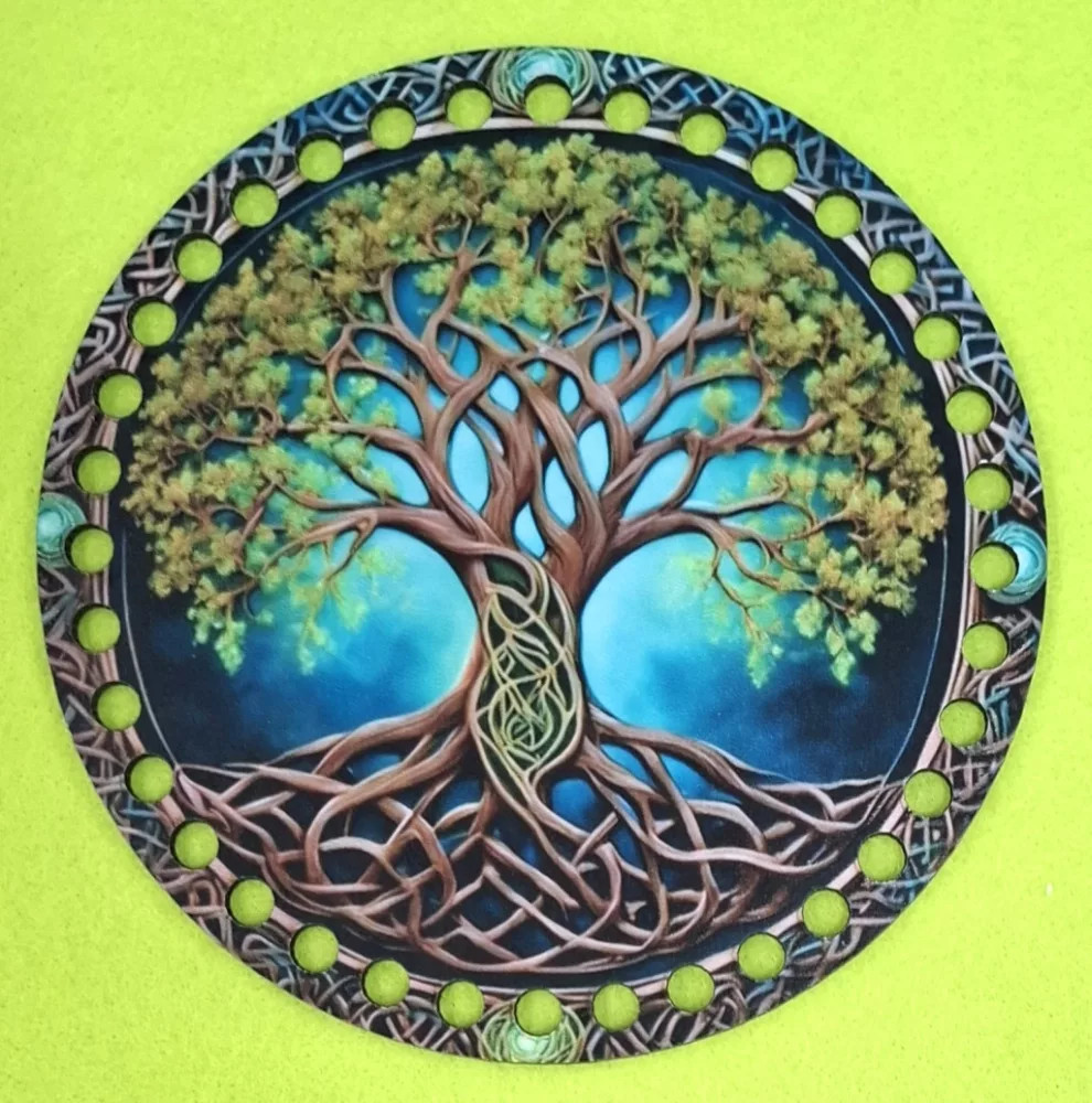 Bază din lemn imprimată pentru croșetat, 15 cm, cu găuri de 7 mm, model arborele vieții în nuanțe verzi – 1 buc. – diametru 15 cm, grosime 2,5 mm.
