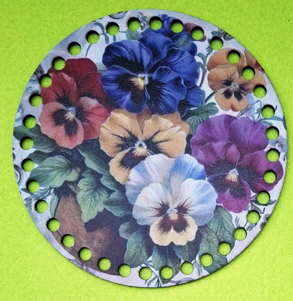 Bază din lemn imprimată pentru croșetat, 15 cm, cu găuri de 7 mm, model panseluțe multicolore în ghiveci – 1 buc. – diametru 15 cm, grosime 2,5 mm.