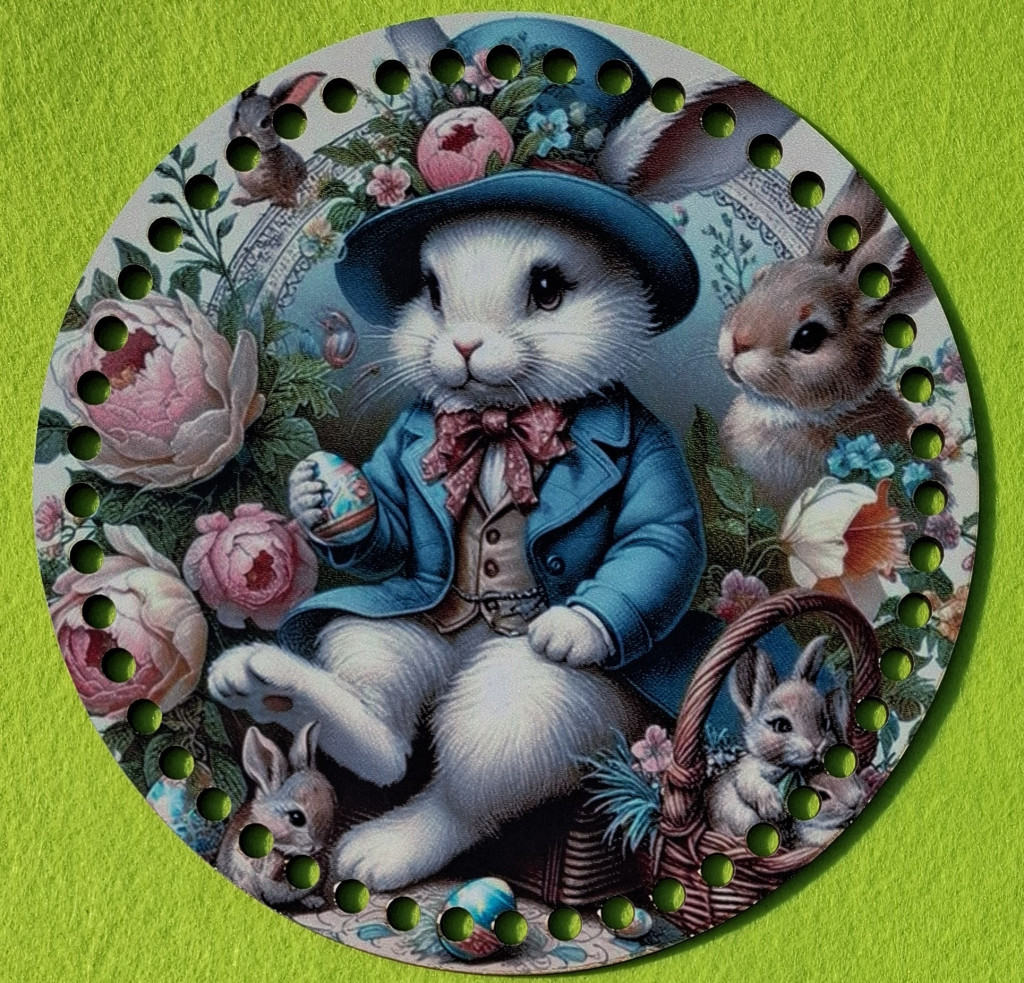 19,5cm Baza din lemn imprimata crosetabila cu gaura de 7 mm Iepuras alb cu palarie. 1 bucata/pachet 19,5cm, grosime 3mm