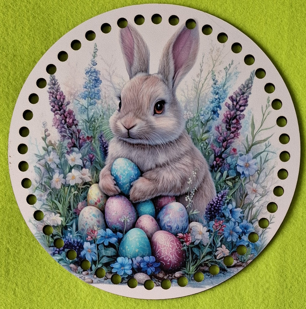 19,5cm Baza din lemn imprimata crosetabila cu gaura de 7 mm Iepuras cu ou în mână printre flori 1 buc/pachet 19,5 cm grosime 2,5 mm