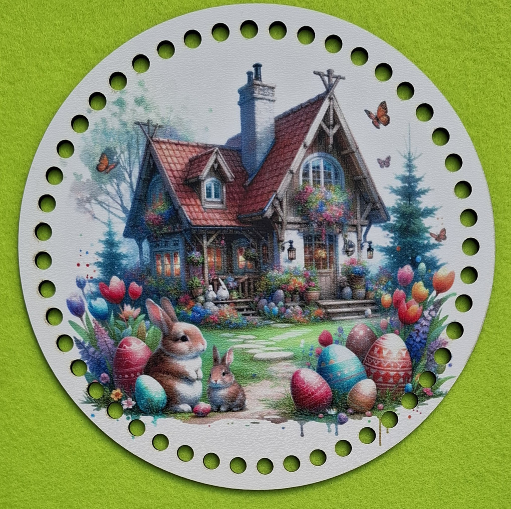 19,5cm Baza din lemn imprimata crosetabila cu gaura de 7 mm, casuta maro în fundal, iepurasi si ouaiîn fata. 1bucata/pachet, grosime 2,5mm.