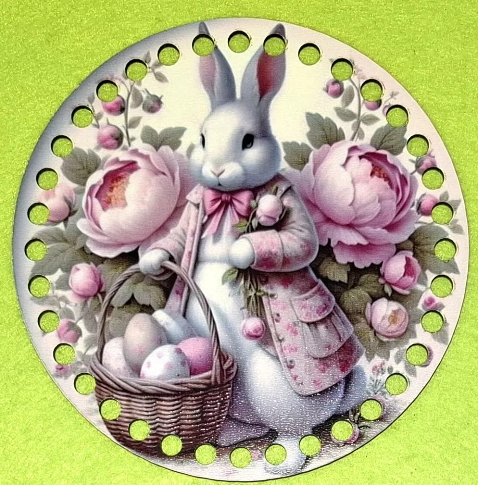 19,5cm Baza din lemn imprimata crosetabila cu gaura de 7 mm Iepuras alb cu floare roz 1 buc. 19,5 cm grosime 2,5 mm