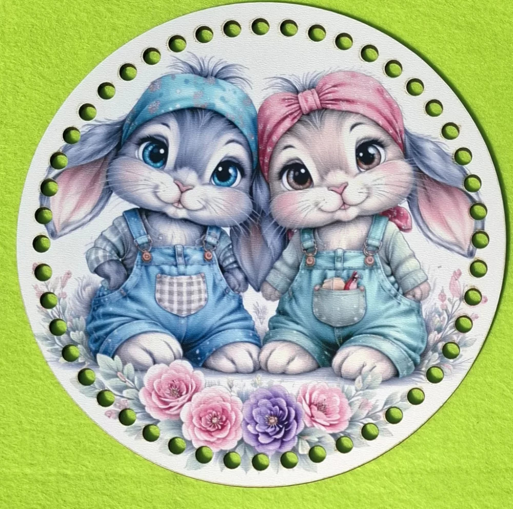 Bază din lemn imprimată pentru croșetat, 19,5 cm, cu găuri de 7 mm, model pereche de iepurași drăguți – 1 buc. – diametru 19,5 cm, grosime 2,5 mm.